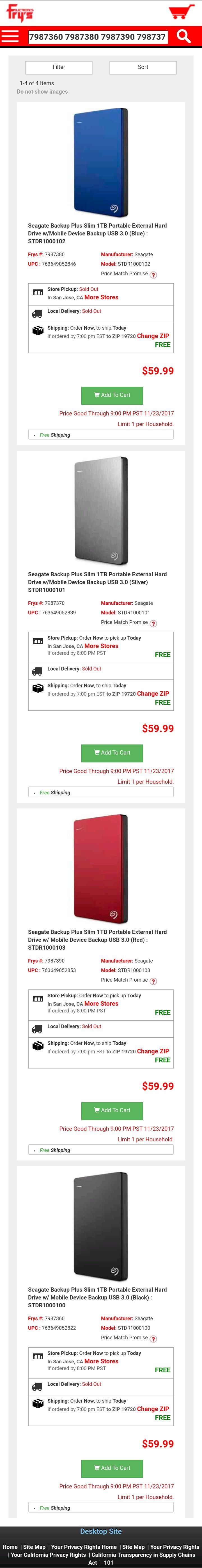 [Frys] Seagate Backup Plus Slim 1TB Portable External Hard Drive w/Mobile Device Backup USB 3.0 ($39/배송비 다양) > 해외핫딜