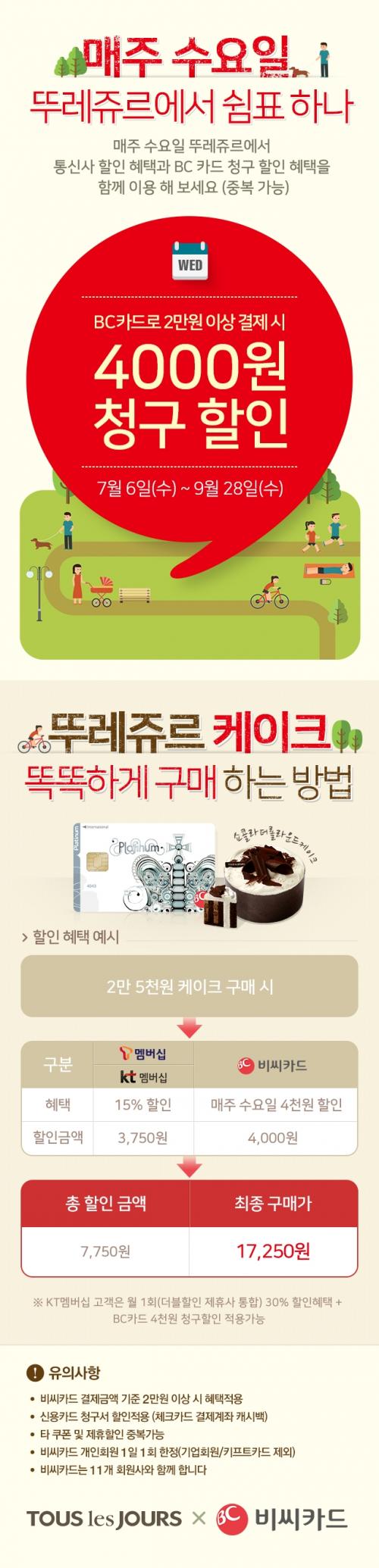 뚜레쥬르에서 매주 수요일 2만원 이상 BC카드로 결제시 4천원 청구할인 해주네요