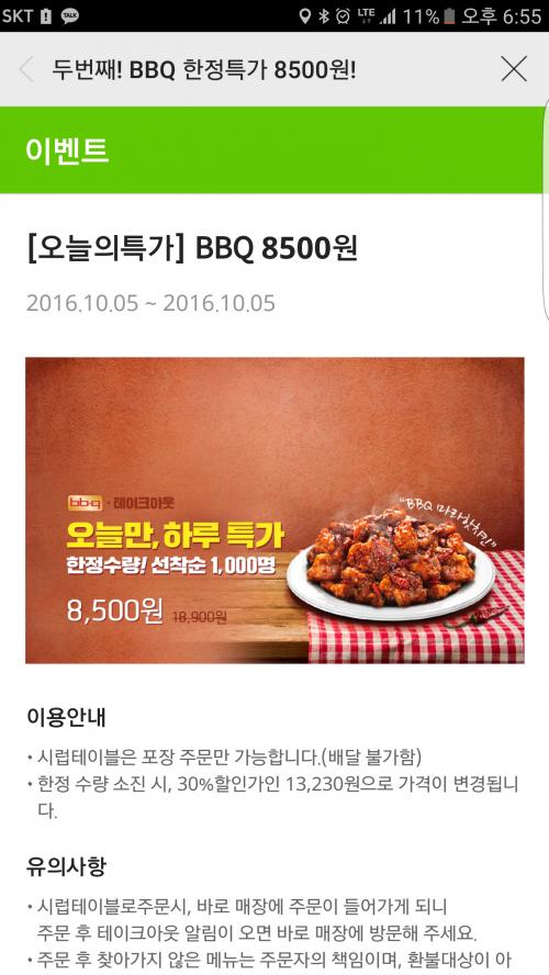 방금 전 별생각없이 들어갔다가 오늘 하루 bbq 마라핫 치킨 8500원 행사발견해서 부랴부랴 결제했네요