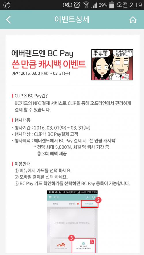 에버랜드에서 쓰면 건당 5천원까지 100%캐시백해준다는 내용입니다. 기간내 총 3회네요.