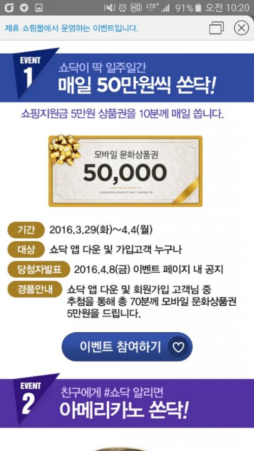 1. 쇼핑지원금 5만원 상품권 매일 10명