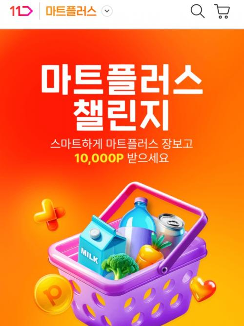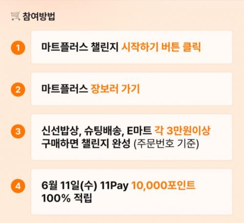 마트플러스 런칭기념 신선밥상/슈팅배송/E마트 각 3만원이상구매 시 챌린지가 완성되며 6/11(수) 11PAY로 1만 포인트 적립됩니다.