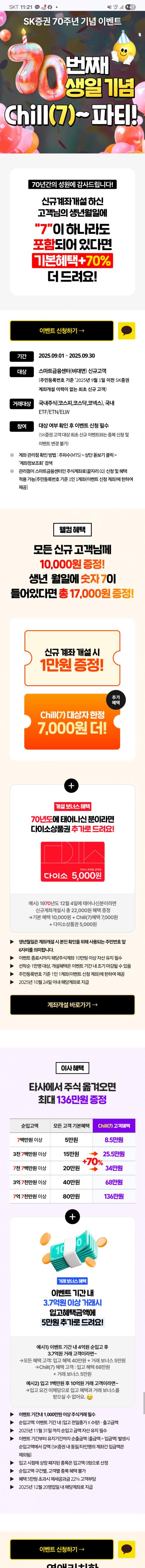 SK증권 70주년 기념으로 신규계좌 개설하면 혜택 70% 추가 지급합니다.