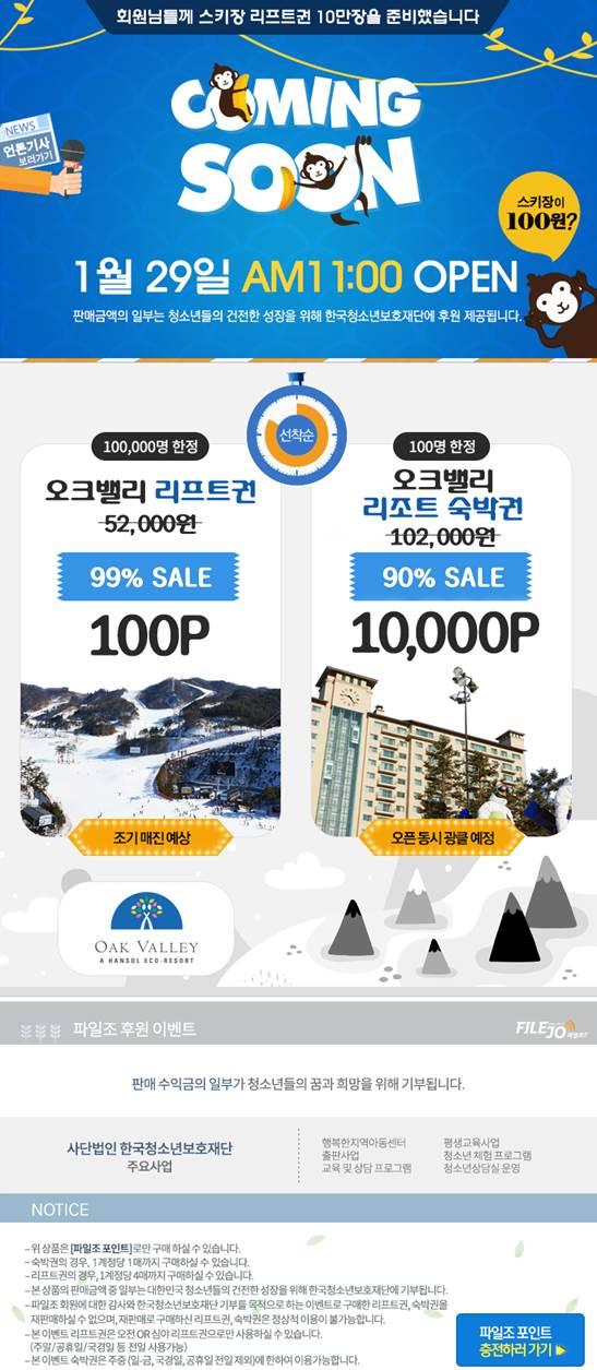 1월 29일 오전 11시부터 리프트권 100원, 숙박권 10000원에 판매를 시작한다고 합니다!