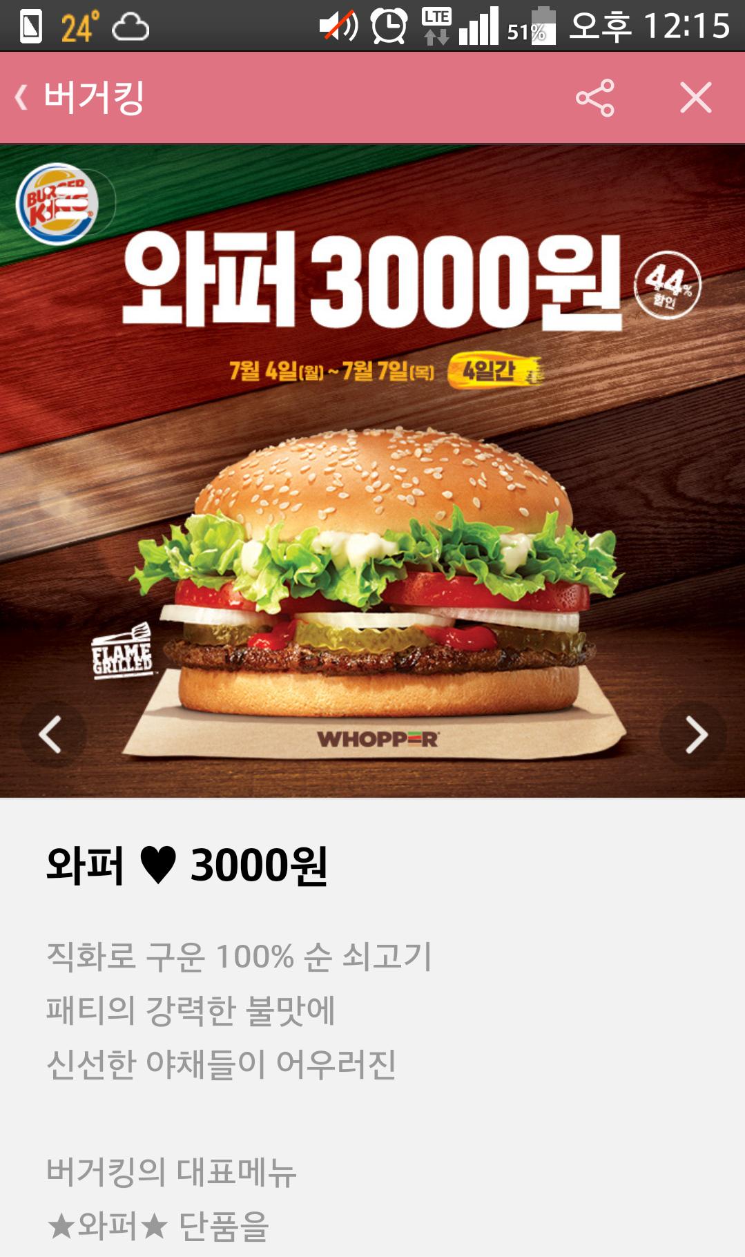 와퍼 이번 딜도 괜찮은듯 하네요. 저기에 올엑스트라 조합에 토마토 한장 추가하면 가성비 쩔어줄 듯 합니다 . |