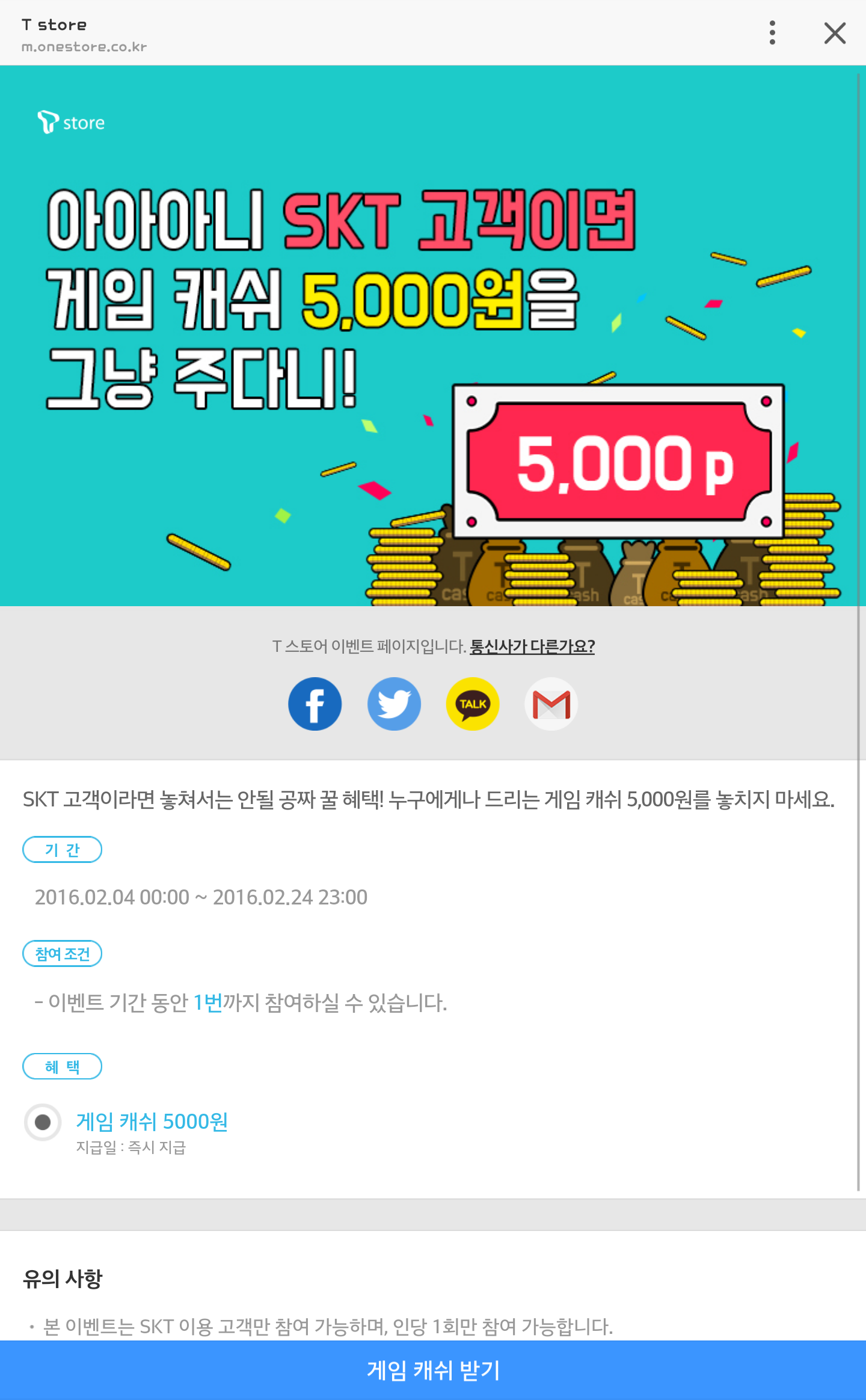 [T스토어] 게임캐쉬 5000 받으세요(SKT회원) > 이벤트게시판