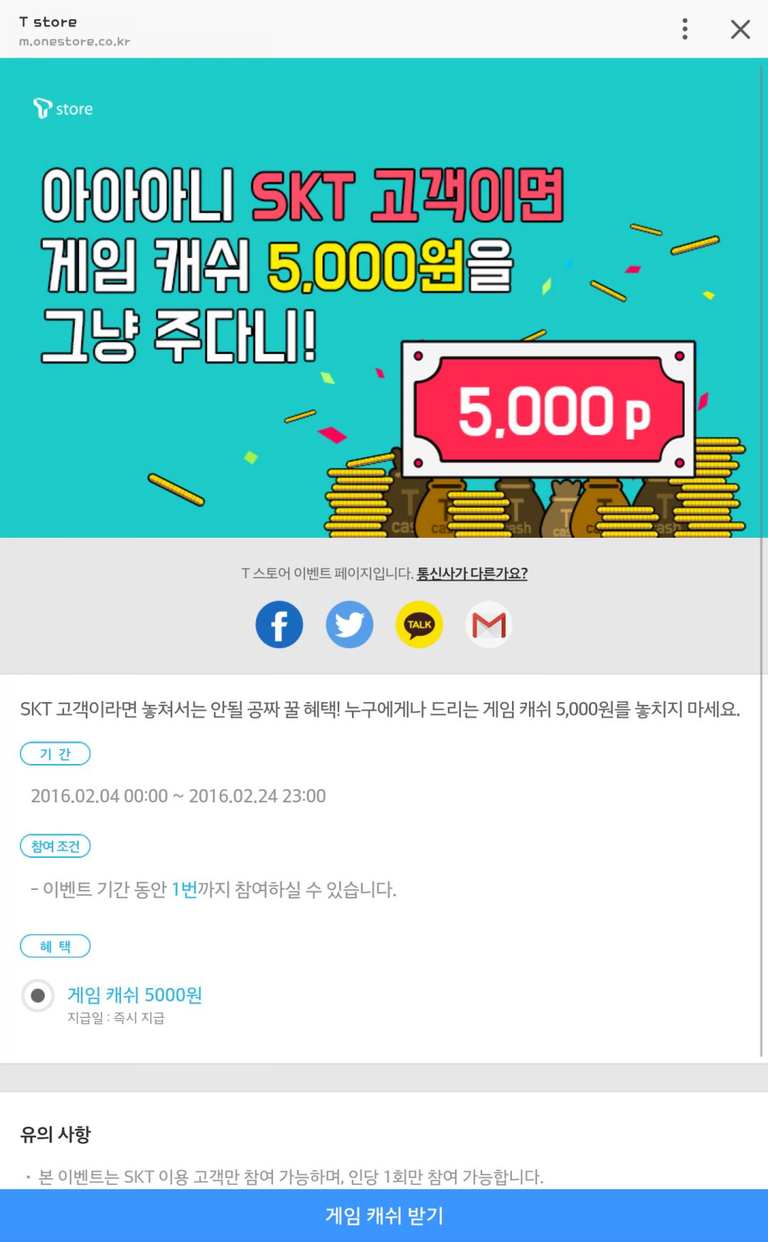 [T스토어] 게임캐쉬 5000 받으세요(SKT회원)