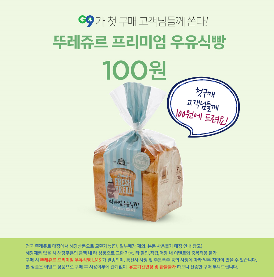 [G9] [종료] (첫구매딜) 뚜레쥬르 프리미엄 우유식빵 (100/sms)