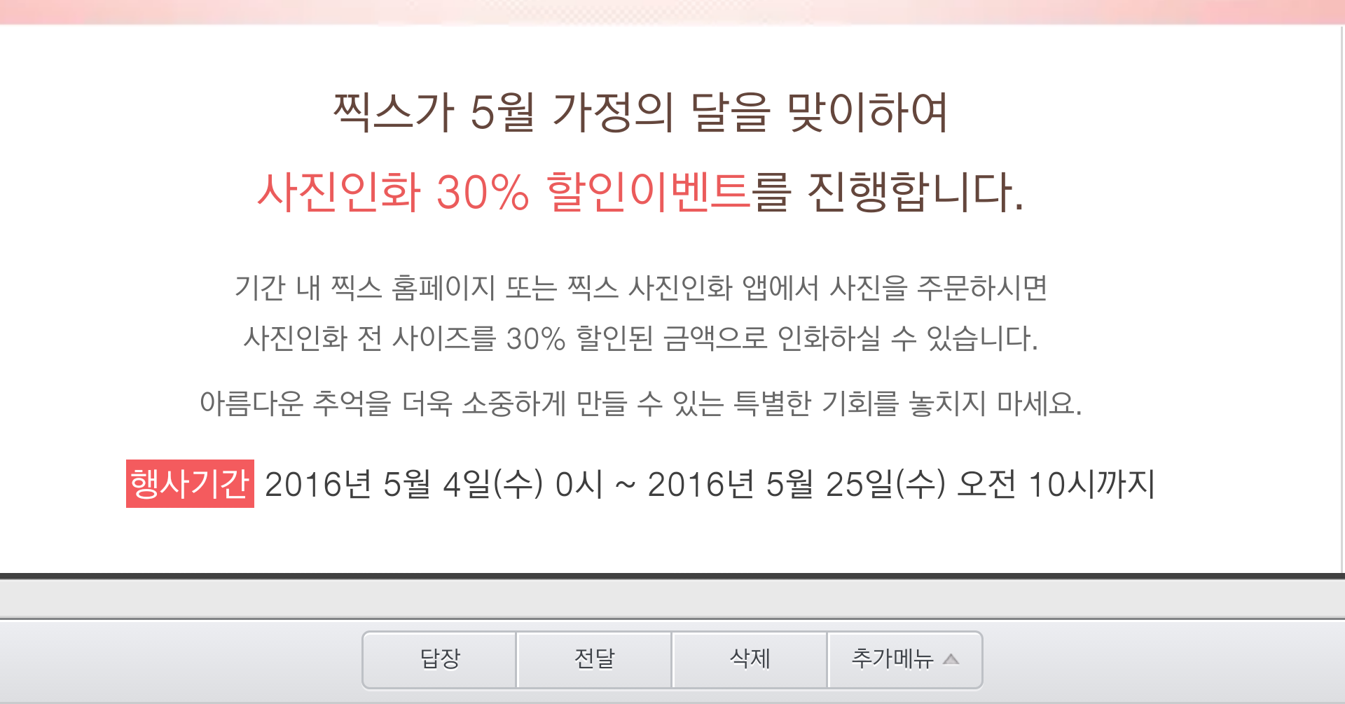 찍스에서 사진인화 30%할인 이벤트가 오늘부터시작합니다(16.05.04~16.05.25오전10시까지)