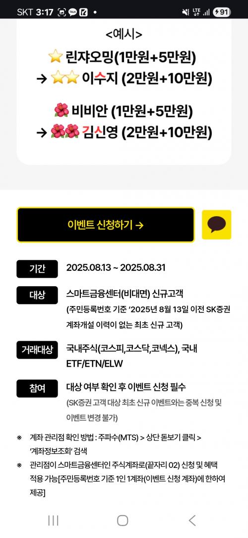 8월 31일까지 이름에 ㅅ,ㅆ,ㄱ,ㄲ,ㅋ 들어가면 신규혜택 2배로 줍니다!