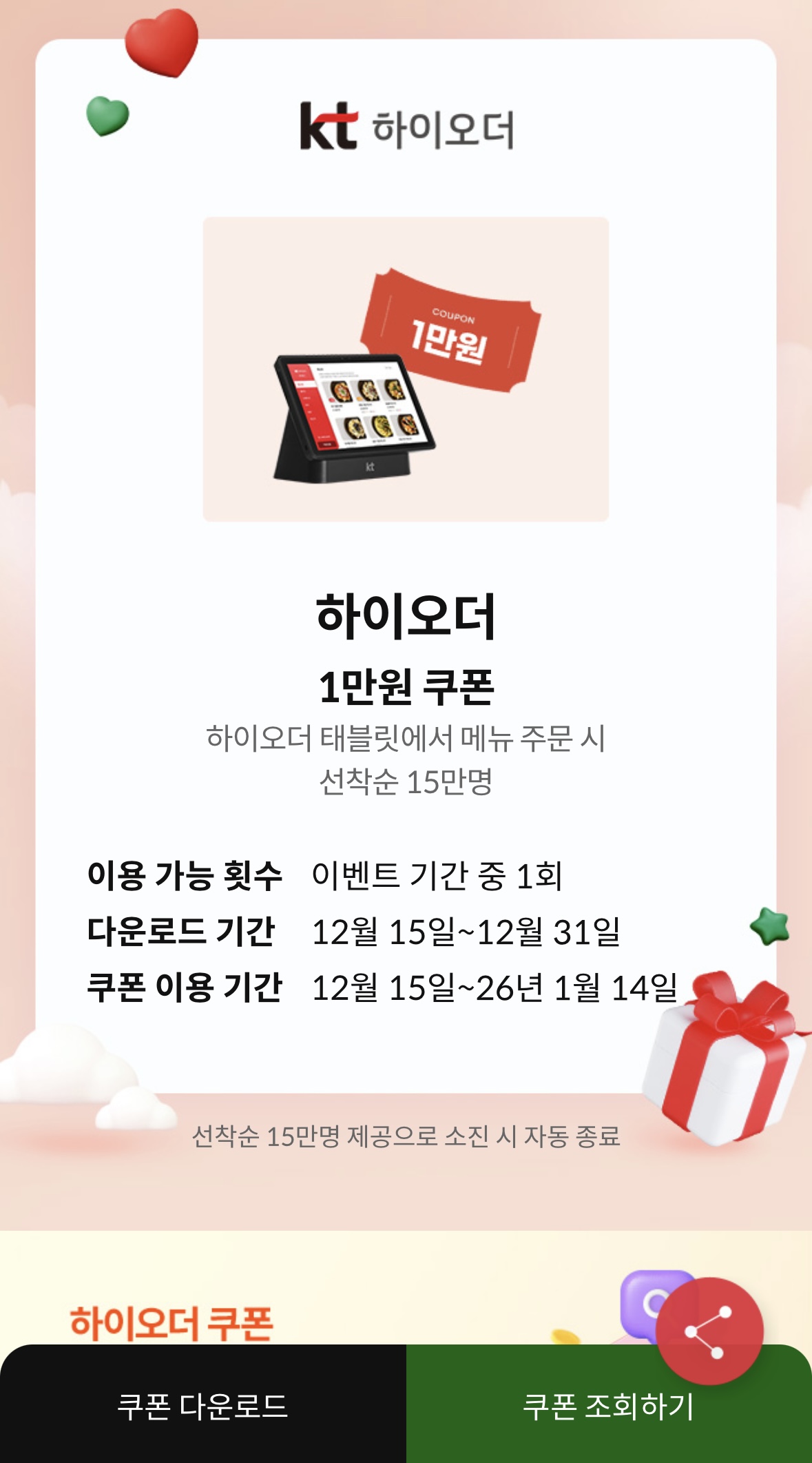 혜택 여러가지 있는데 하이오더 1만원 쿠폰 받았네요