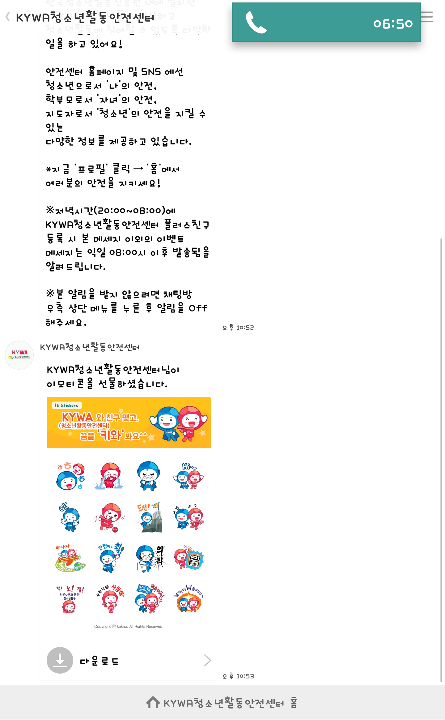 KYWA청소년활동안전센터 추가하고 이모티콘 받으세욧