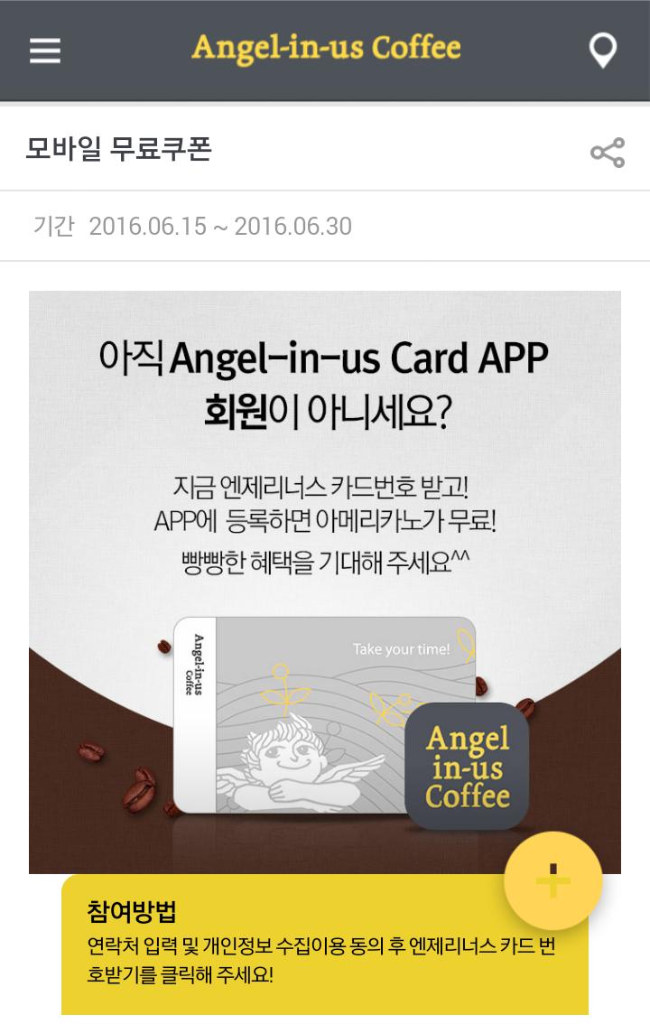[끌올] 엔제리너스 앱카드 신규등록시 아메리카노 무료 (~8/31로 연장) > 이벤트게시판