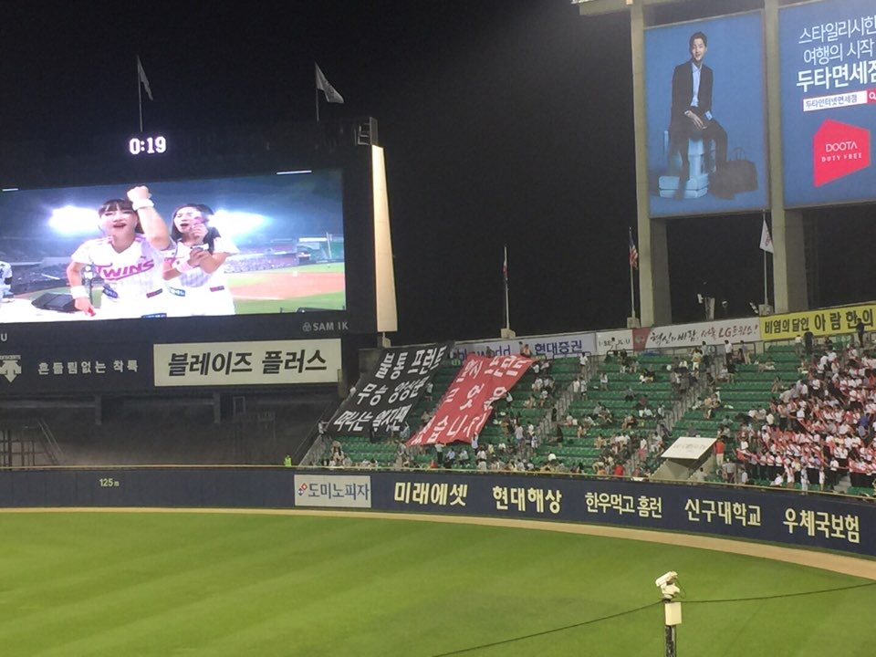2. 당일날 LG그룹 신입사원들이 단관 와있었습니다. 사진에도 보시면 오른쪽 끝에 양복부대(...)가 있으신걸 볼 수 있습니다. 심지어 LG그룹 연수라 그런지 치어리더도 2명이나 파견 갈 정도였습니다. 그리고 더욱 하필이면 딱봐도 "아 쟤네 무슨 현수막 펼쳐서 응원할라나보다..." 하고 꼬물꼬물 하면서 준비하는 도중에 저 현수막이 펼쳐졌습니다. 멀어서 잘 보이진 않았지만 아마 벙찌지 않았을까 합니다.