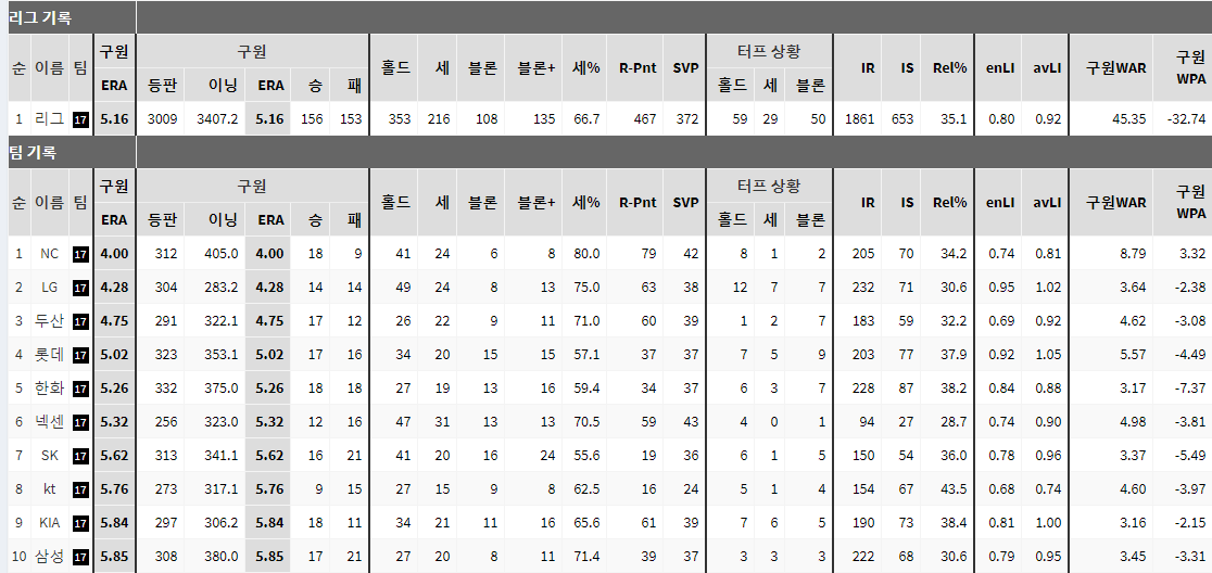 불펜 팀 방어율 9위 등극~!!