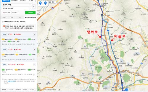 1. 용마산길 -> 신내IC -> 별내농협(별내성당)옆길 ->광전Ic->청학터널->의정부교도소->만가대교차로(여기가 의정부)