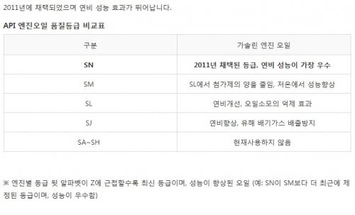 위에 정보를 보고 SN이 최신제품이고, 점도는 5w40이 더 좋지만 그정도 추우면 어차피 안탈테니 크게 상관없고, 그러나 SJ대비하여 성능(연비개선, 저온에서 성능향상, 오일소모억제)에서 향상이 있다하여 당연히 최근오일인 SN으로 선택하여 우선 2통만 주문했는데요.... 주문하고 조금더 정보를 찾아보니 등급이 최신이라고 무조건 더 좋은건 아니라네요??@,.@