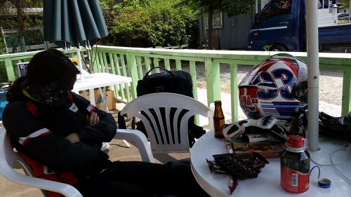 어제부터 컨디션 난조로 에어컨 바람을 피해 잠시 바깥에서 햇볕좀 쬐고 미리 챙겨간 바막을 꺼내입습니다.