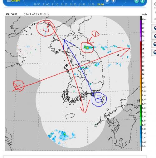 우리나라 비구름은 좌에서 우로...위에서 아래로 내려옵니다...
