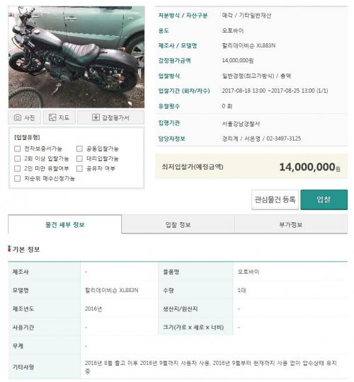 온비드 같은 경우에는 미리 직접 가서 상태 확인하시고 경매 참여하세요. 경찰서에 전화하시고 방문한다고 하시면 될겁니다. 그럼 그 시간에 보시면 되는데 오토바이 같은경우 멀쩡한 상태는 별로 없다고 보시면 되요. 도난차 위주인데 보관하는 것도 자리가 별로 없어서... 중고상태 진짜 전문가처럼 잘 보시는 분 아니라면 말리겠습니다.