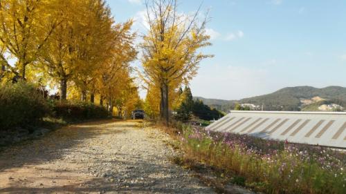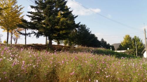 축사 뒤로 이어진 언덕에 코스모스와 노란 은행 나무들의 역광에