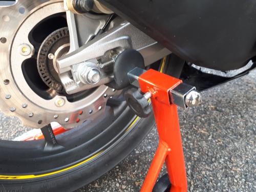 리어스탠드를 바이크 스윙암에 걸치고 지렛대원리를 이용하여 뒷부분을 아래로 내려주니 손쉽게 뒷바퀴가 공중에 뜹니다~ 미하엘님이 앞에서 바이크를 잡아주니 제꿍의 불안감없이 한번에 팍~~~^^