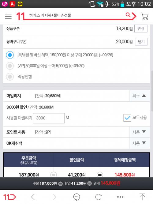 도합 -41,200원 해서 145,800원에 결제했습니다. 오늘 사온 엔맥이에 달린 샤드 39가 생각보다 작더군요. 그래서 방금 네이버에 샤드48 검색해보고 아무생각없이 11번가 들어가니까 하단에 할인쿠폰 팝업창이 뜨네요. 뭐지? 하고 누르니 자전거/레저 15만원이상 15000원 할인 쿠폰을 준대요 헐...... 그래서 다운받고 샤드48 장바구니에 넣고, 폰으로 11번가 앱켜서 할인쿠폰 적용시켜보니 오오+_+... 게다가 언제 받았는지 어디서 생겼는지 모를 2만원 할인쿠폰까지;;;