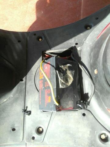 문제의 배터리인데요. 테스터기로 측정해보니 11.5V 밑으로 측정이 되는 것 같습니다. 제가 점퍼선이 없어서 점퍼를 하지는 못하고 아래 사진과 같이 집에서 굴러다니던 자전거 배터리를 임시로 절연테이프로 감아서 가지고 왔습니다. 크기가 달라서 배터리 박스에 들어가지 않아 간당간당하게 올려놓기만 하고 데려왔네요.