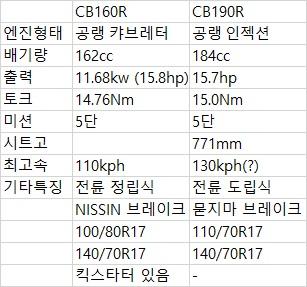 CB160R 최고속은 혼다 홈피에서.. CB190R의 최고속은 인터넷 도는거에서 찾아봤습니다 ㄷㄷㄷ