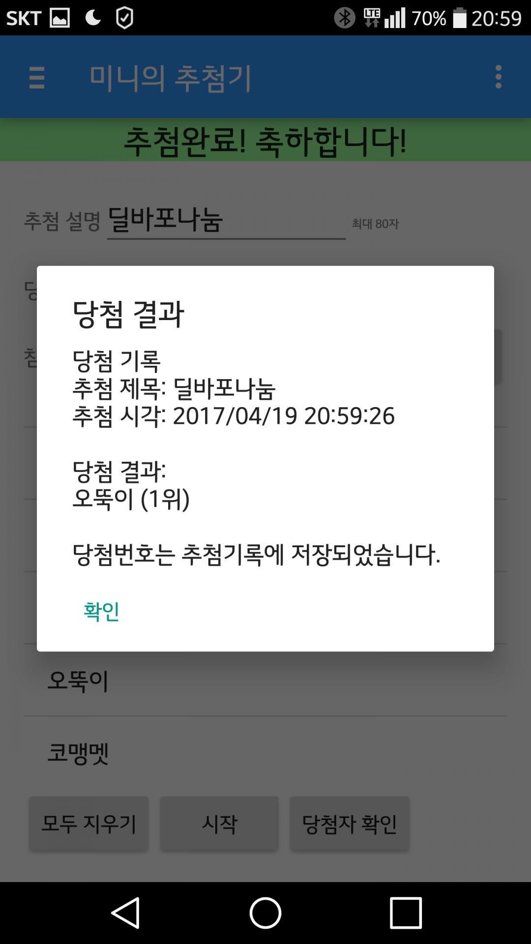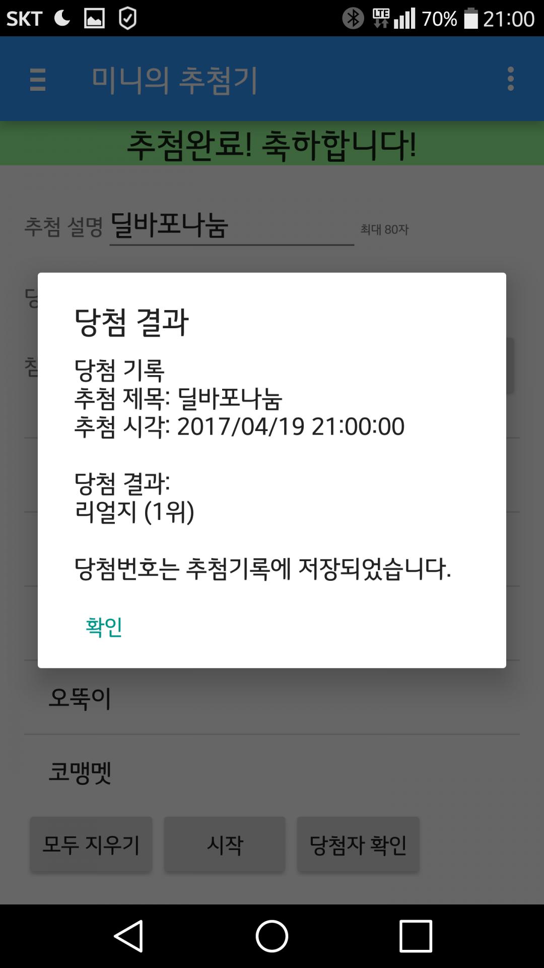 추첨기 어플로 9시 정시에 추첨하려 했으나 딸랭구랑 놀다가 실수로 한번 추첨.