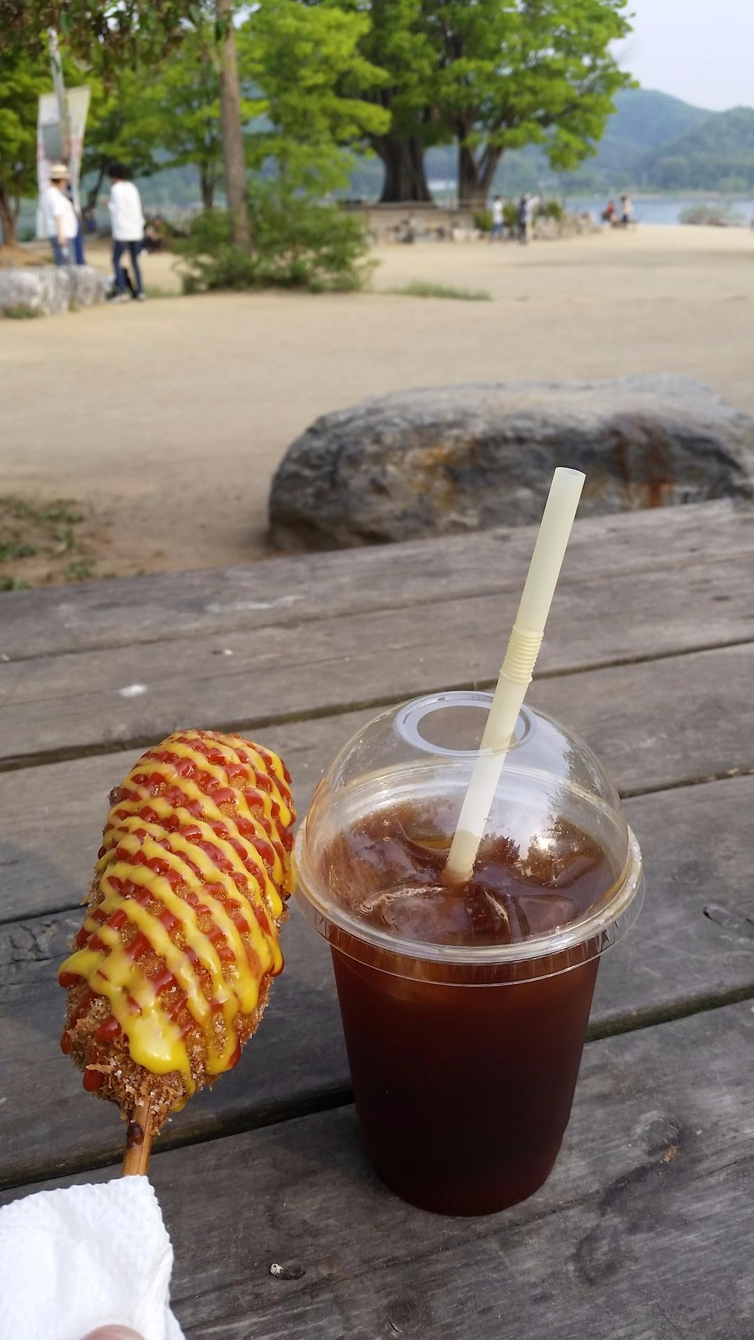 물과 바람에 아이스 아멜카노한잔과 같이 먹으니 맛있네요~ㅋ집앞에 천원짜리 핫도그랑 비교되긴하네요~밀가루의 뻑뻑함이 없고 부드럽고 쫄깃합니다~