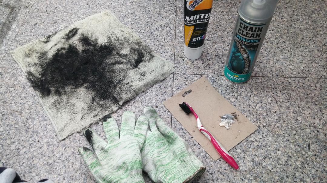 2. 장갑을 끼고 신문지를 깔고 앉아서 걸레에 클리너를 뿌린후 체인을 붙잡고 닦아낸다! X 100