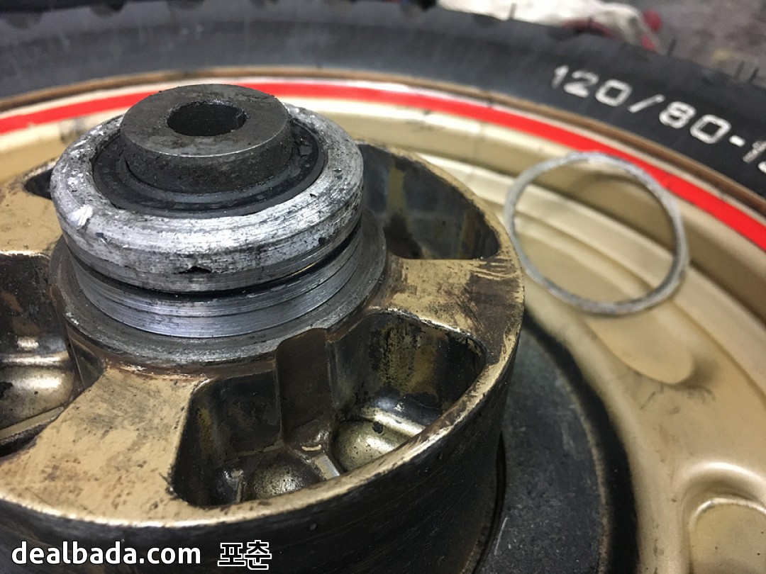 리어휠에 대기어를 고정해주는 축이 많이 마모되어 대기어가 제대로 고정되어있지 못하고