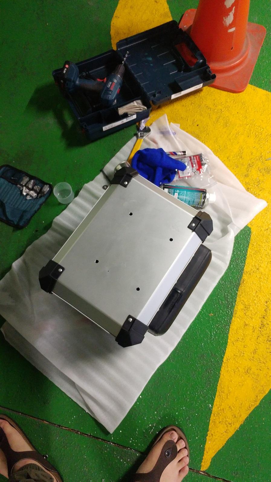 리어캐리어 모양에 맞춰서 탑박스에 드릴뚫을 자리를 맞춰서 마킹해줍니다