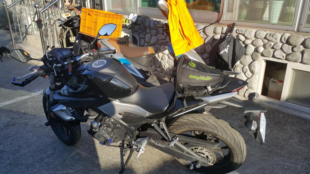아침일찍 일어나서 응?? 왜케 춥지... 나눔받은 리어시트백 설치후 안에는 담배2갑 물티슈100장짜리 인하고 곳춧곳춧 가루 챙기고 떠날준비를 합니다 안되겟다.. 반팔에 3계절용 메쉬자켓 입고갈랬는데 초경량 바람막이 추가 합니다 해뜨면 따뜻하겠지(여기서부터 인생 최대의 실수를하게 되는데.....)