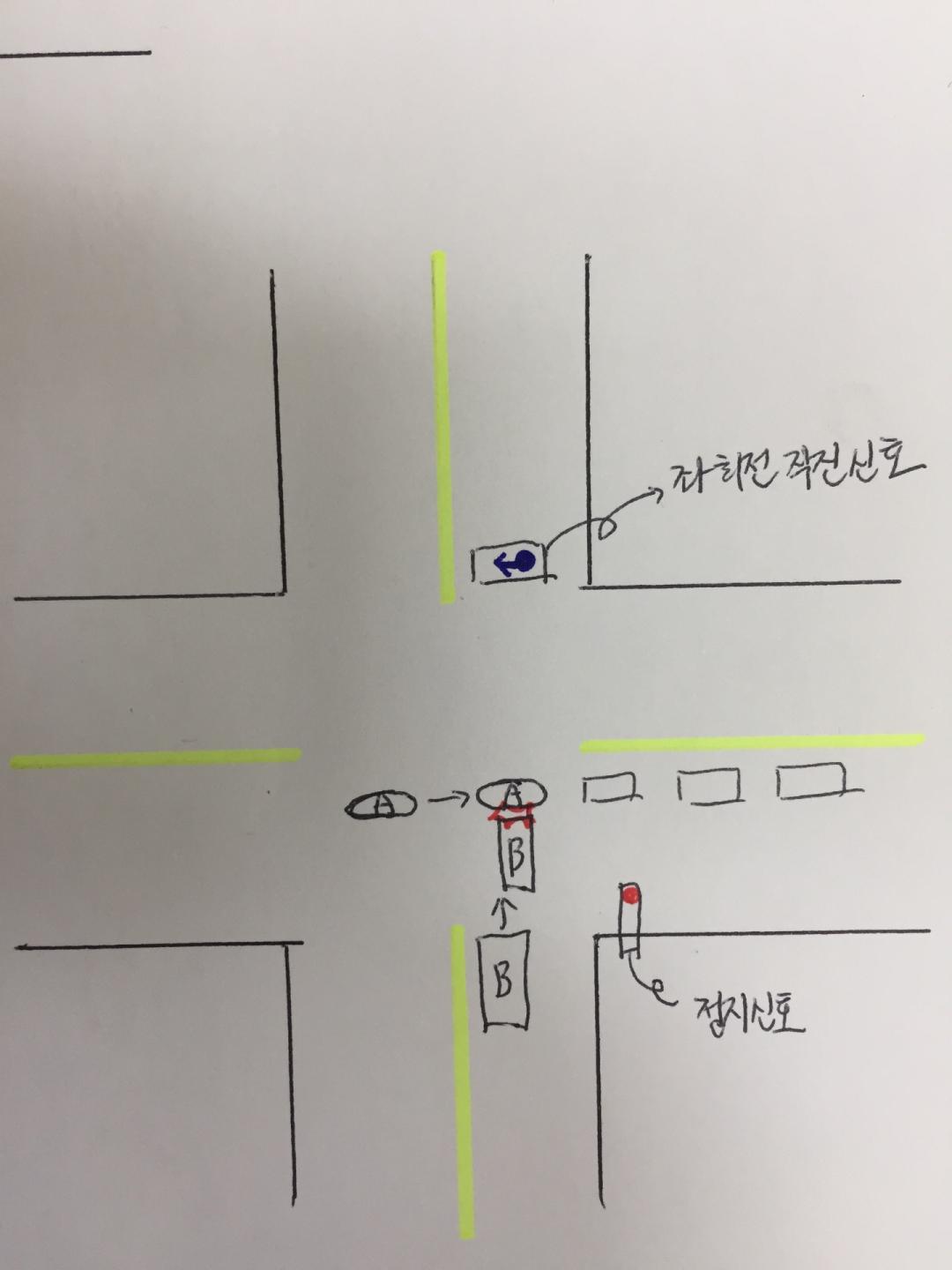 - 결론: 차량B가 가해자입니다. 본인의 주행 신호가 떨어졌어도 차량이 정체될 경우 교차로에는 진입을 하면 안됩니다. (도로교통법 제25조 5항 참조)
