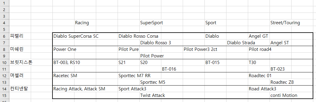 접지력 순으로 왼쪽에서 오른쪽으로 정렬해보았고, 스트릿/투어링 부분만 앞에 있는 게 좀더 좋은 모델입니다 ㅎㅎ