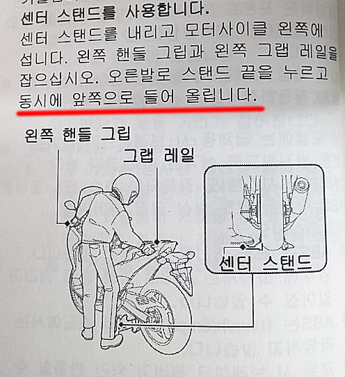 그동안 오토바이 뒤쪽을(미등방향) 들어 올리면서 세웠습니다.