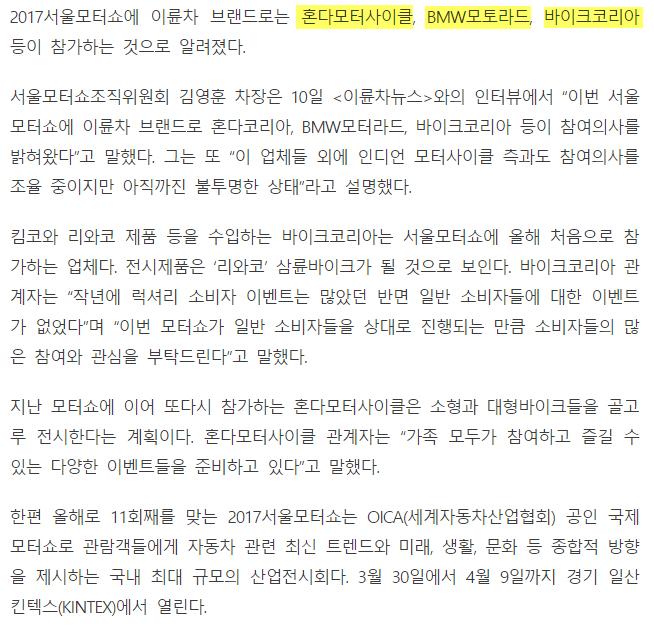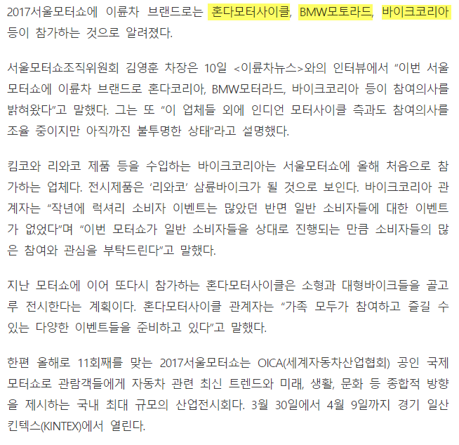 완성차 위주긴 하지만, 이륜차도 혼다 / bmw / 킴코 등이 참여 할 것 같네요.