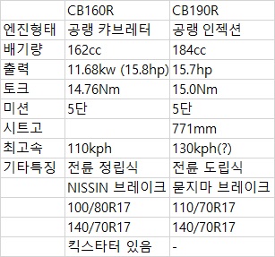 일단 CB160R은 인도혼다.. CB190R은 중국혼다 같구요..