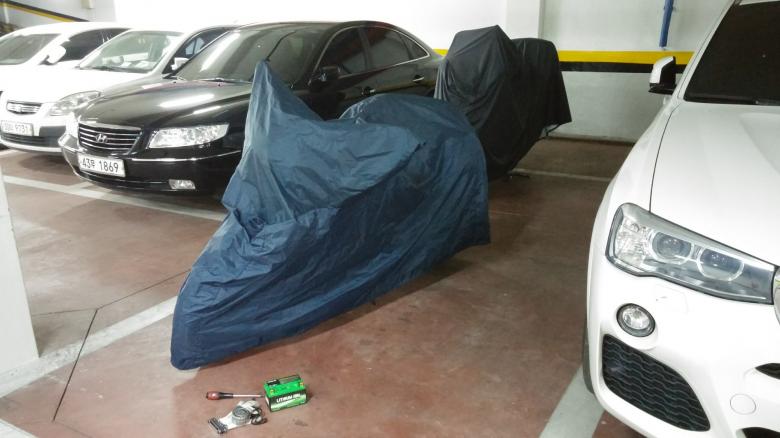 어제 해안도로 라이딩갔다와서 머플러열 식혀준다고 커버를 못덮고 주차해놨었습니다.
