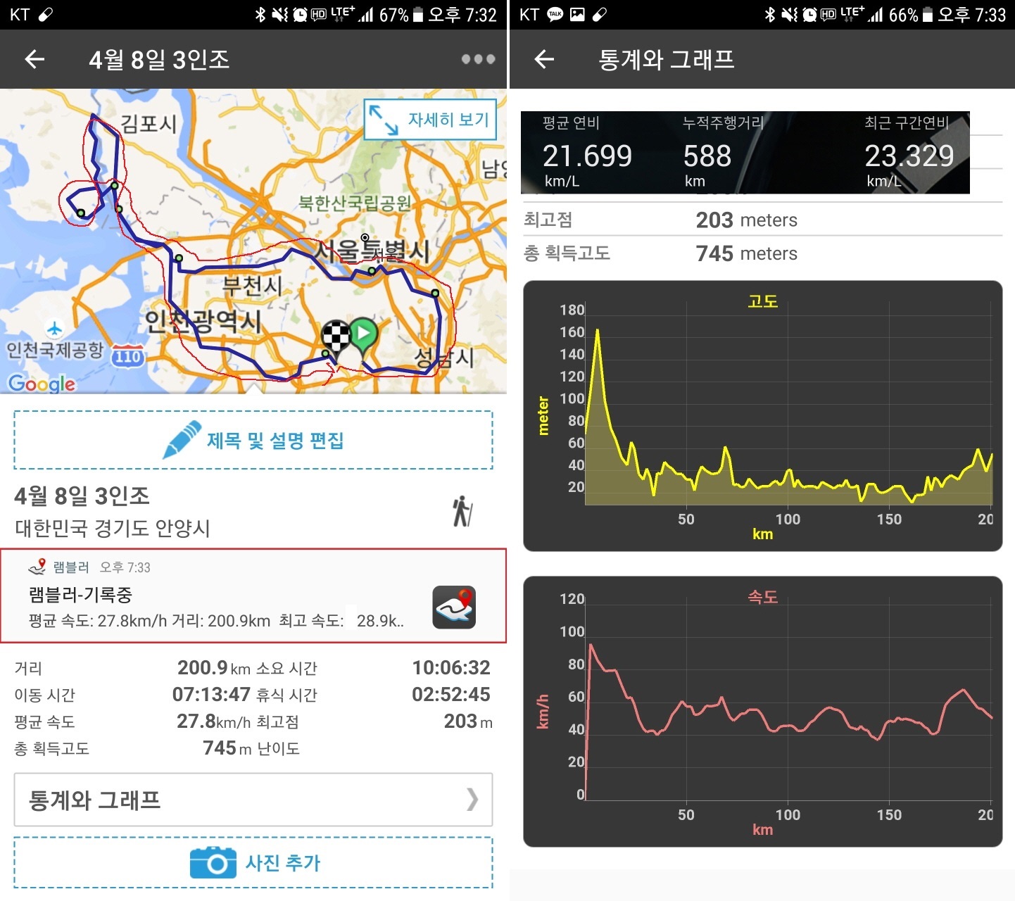 램블러상 200km 정도지만 누락된게 5키로정도는 되니 205키로 정도네요;;