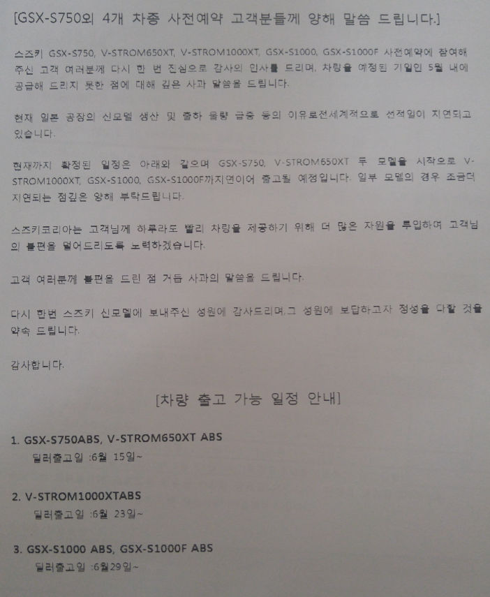 스즈키 GSX-S750, V-STROM650XT, V-STROM1000XT, GSX-S1000, GSX-S1000F 출고 관련. > 바이크포럼