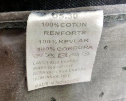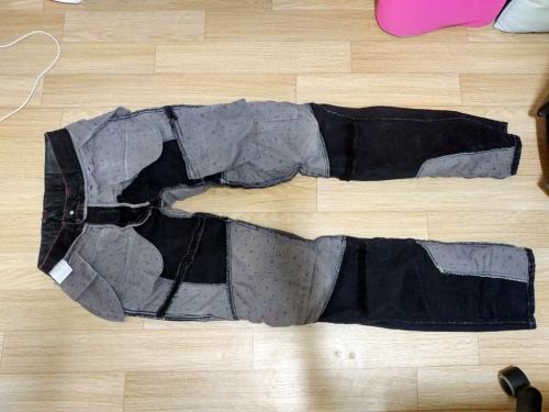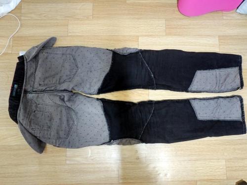 사용하면 보통 골반과 무릎부위에 노란색으로 안감 덧댐이 들어가는 경우인데 사진상으로는 안보이네요. 코듀라는 보통 가방에 사용하는 (투미 같은 올 굵은 재질)것인데 역시 안보이고요. 그리고 케블라 사용했다면 가위나 칼이 들지 않아서 일반적인 방법으로는 수선이 불가능합니다.