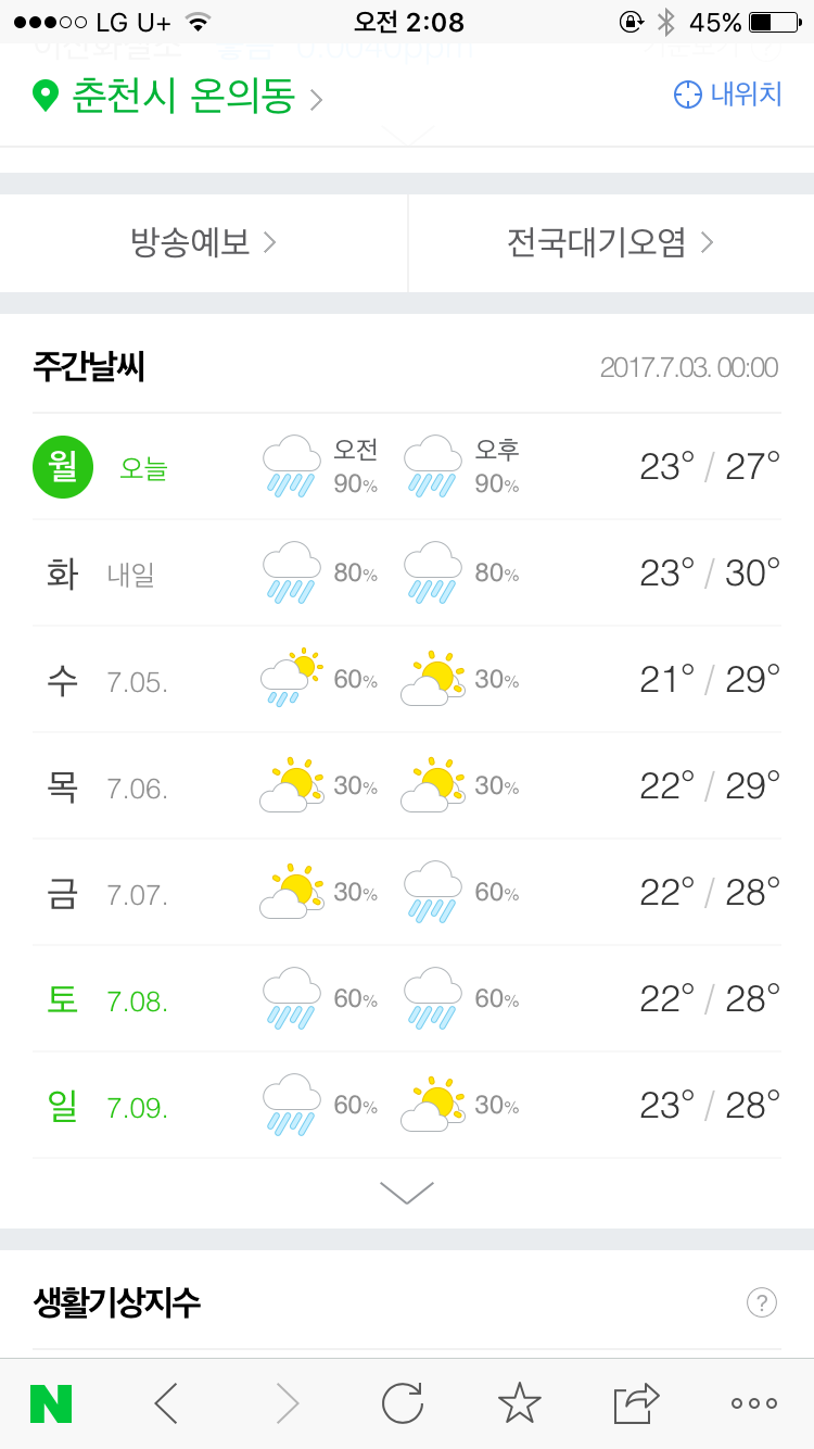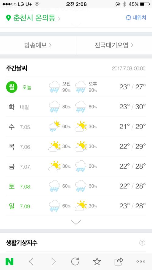 수요일 오후에 시험인데 주간예보를 보니 기가막히게도 수요일 오후는 강수확률이 낮네요!