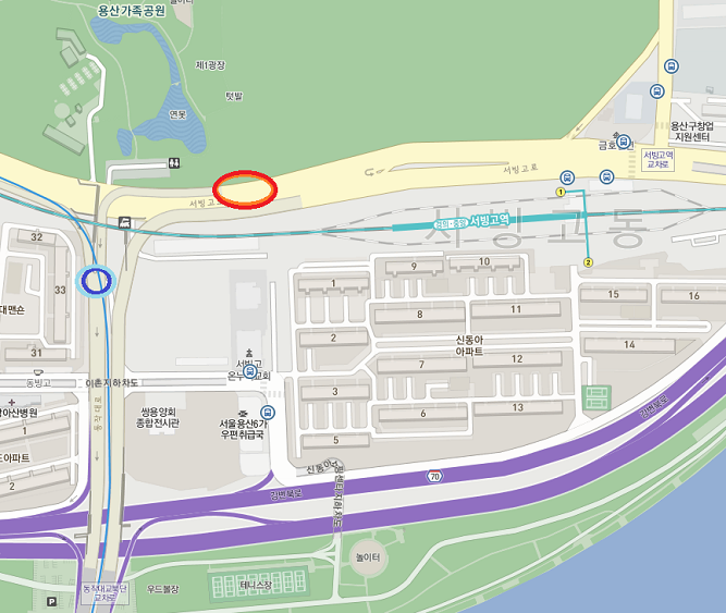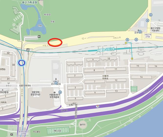 서빙고역 교차로에서 출발, 이촌역 방향, 동작대교로 올라가는 고가로는 맨끝 하위차선입니다.