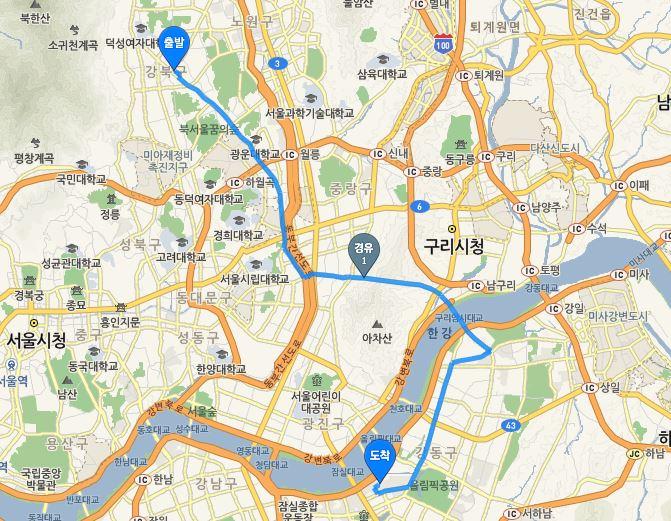 도봉~잠실구간 ㅠㅠ..편도 1시간거리인데 바이크로는 신호와 차량 신호대기상태에따라 40~50분 걸리네요 ㅎㅎ