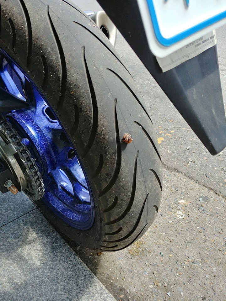 어쨌거나 체인루브 계속 도포해야되니 뒷바퀴 슬슬 굴려보는데.. 아 젠장 나사가 박힌게 보입니다. ㅠㅠ