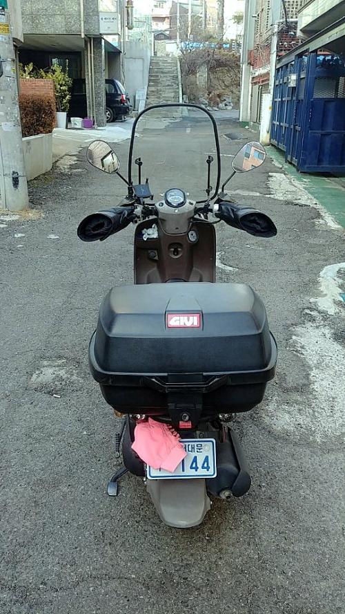 4. 튜닝여부 : 앞 바스켓, 알존 브라켓 + 리어 시트, Givi 20n 탑박스(키뭉치 교체), 2줄 LED, 시거잭, 에쿠스혼, 리어쇽(알리발 짭인듯.. 순정 있습니다.), 태양사 사이드 미러, 윈드쉴드, 핸드폰 거치대