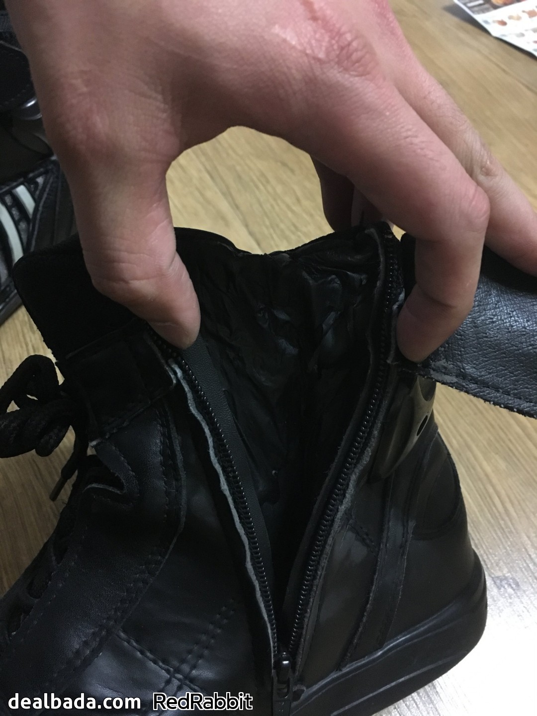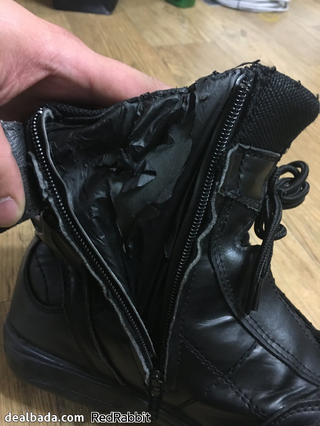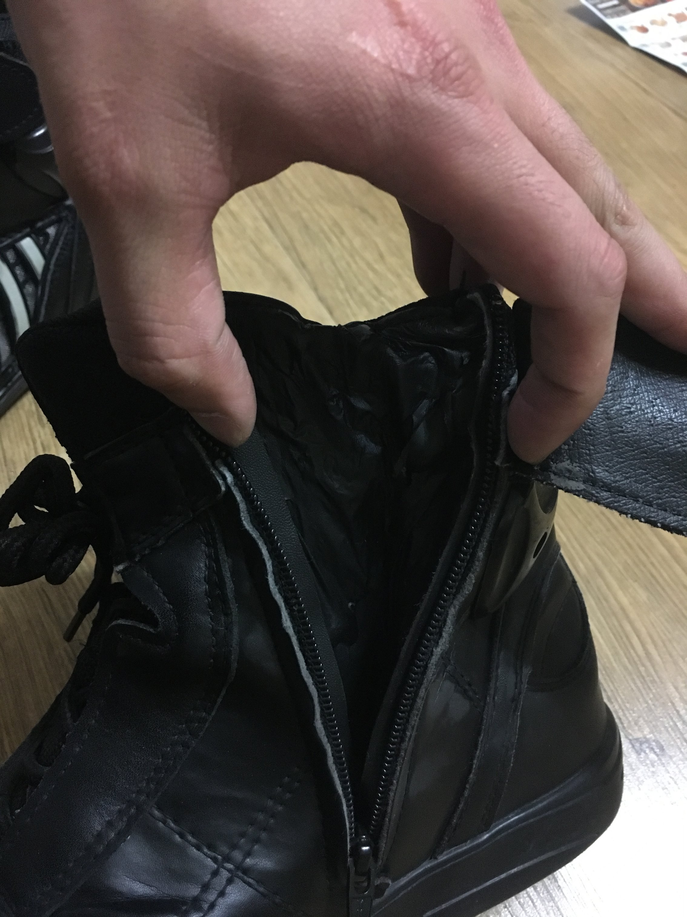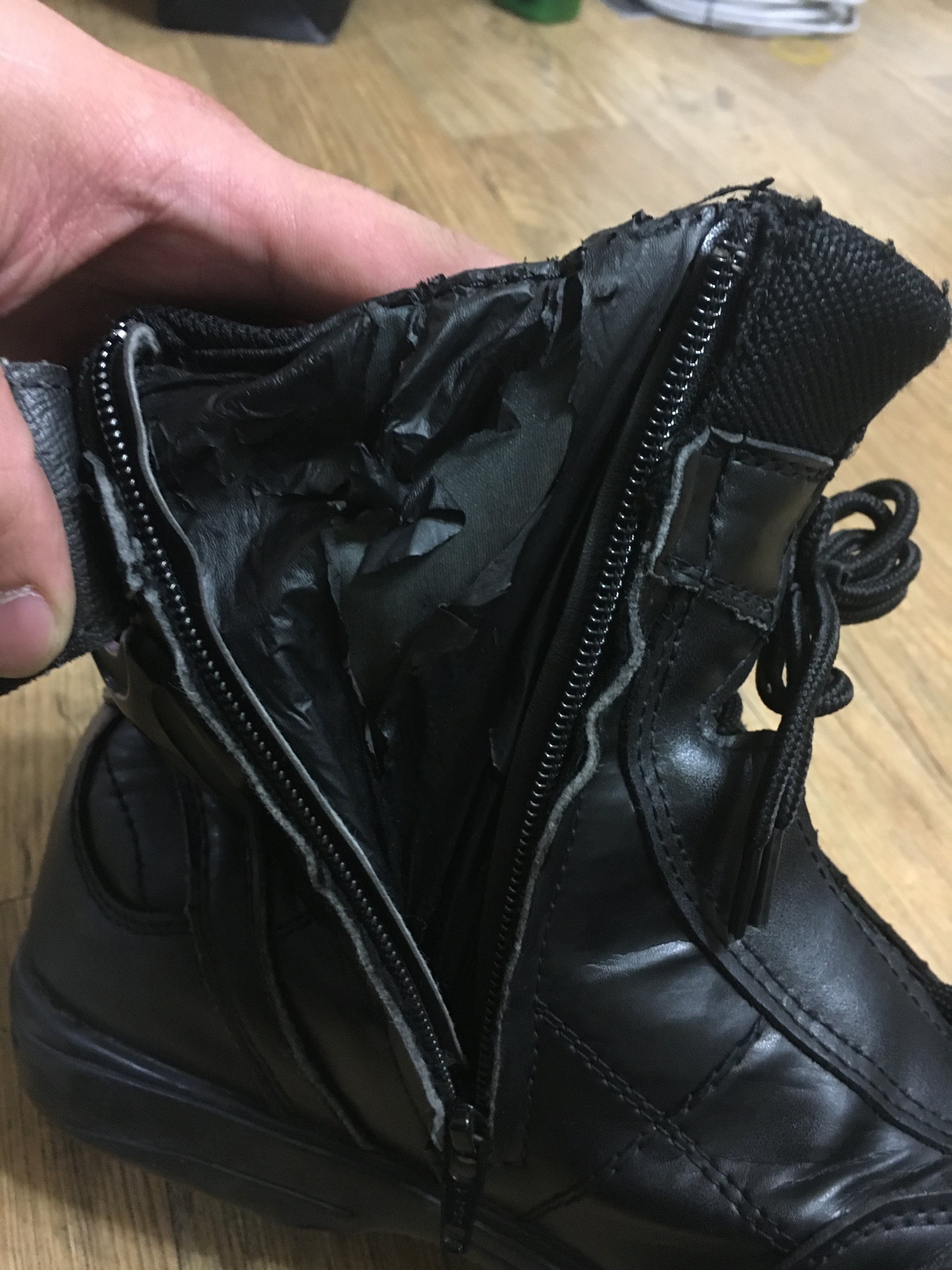부츠 양쪽 다 지퍼 안쪽 내피 껍데기가 엉망진창입니다. 그래도 지퍼 잠그는데 문제없고, 보이는 부분은 아니어서 다행이라고 생각합니다. 차라리 다 뜯어내는게 낫겠다 생각이 듭니다.
